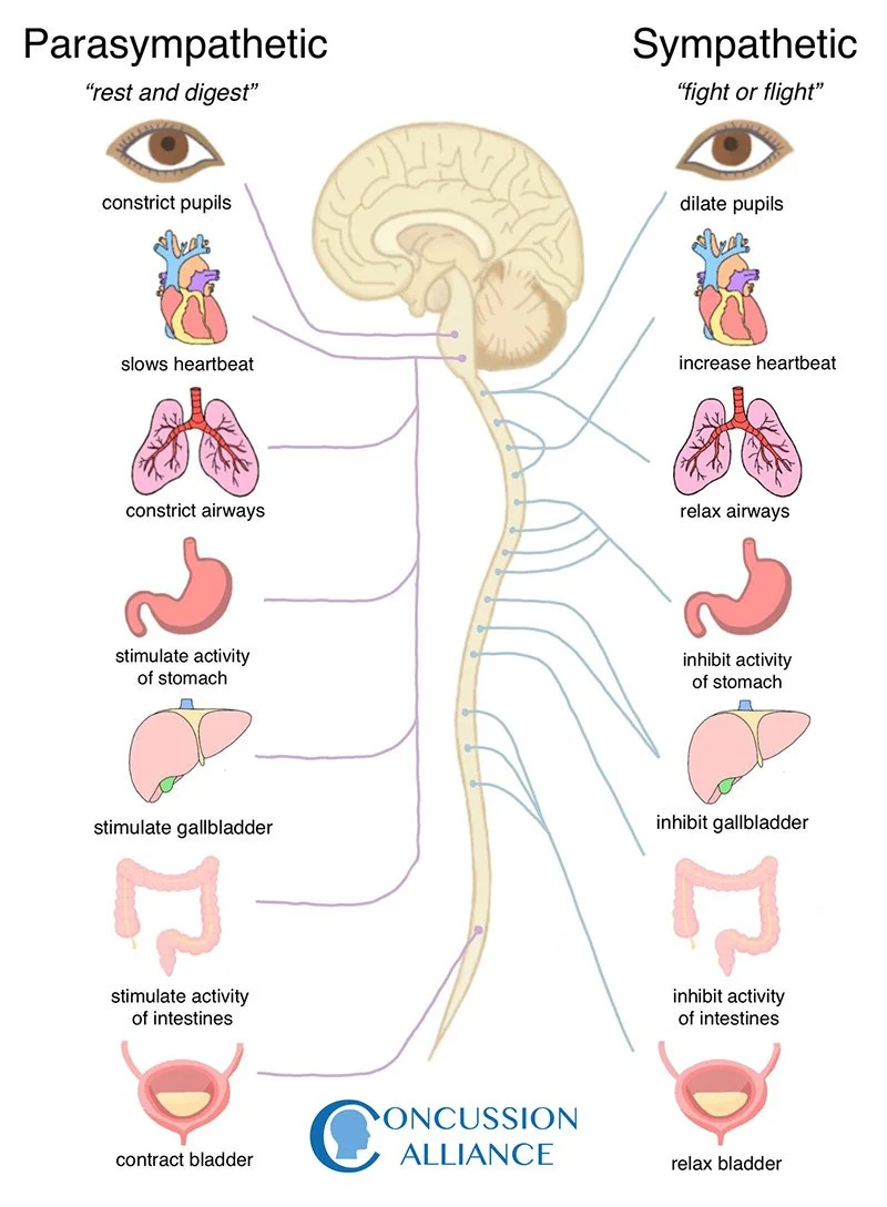 Visual created by Lori Mae Yvette Calibuso Acob (2021 Concussion Alliance Intern), illustrating the functions of the sympathetic and parasympathetic nervous system. Click on the image for a printable PDF.