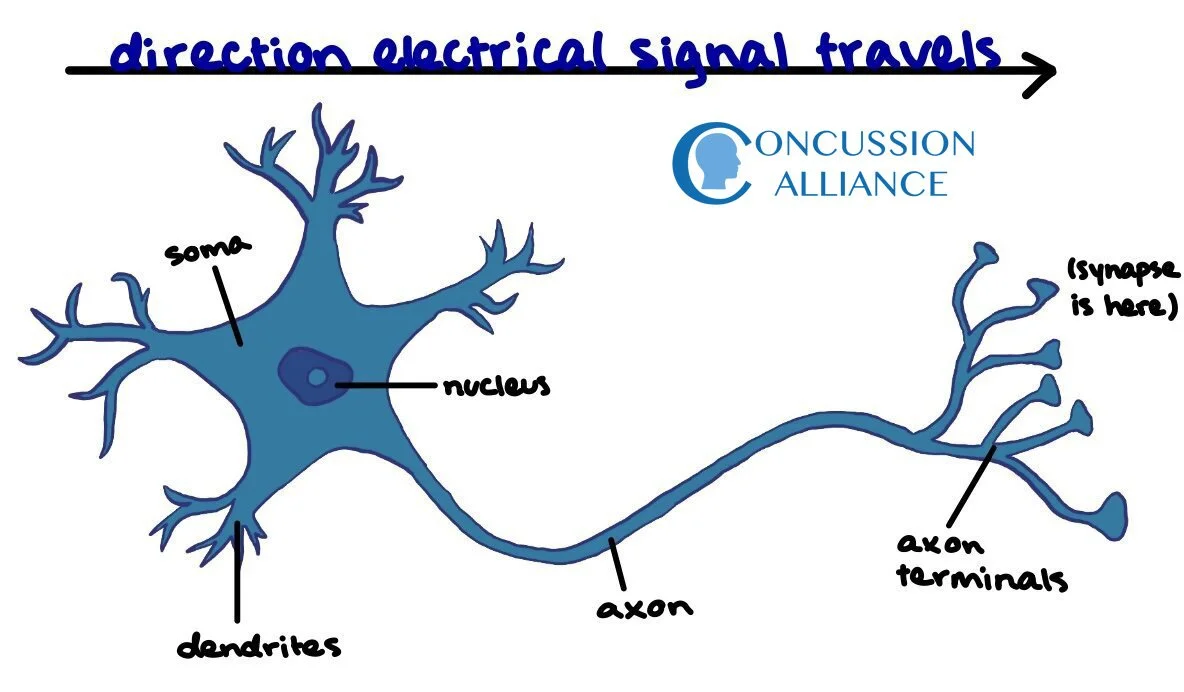 Exploring key features of the brain may also help suggest additional possibilities as to why it is difficult to diagnose ANS dysfunction after a concussion. Neurons are specialized cells that serve as the working units of the brain: they transmit information to other neurons, muscle cells, and glands. Neurons contain unique components that we can't find in other cells in the body: dendrites, axons, and synapses. Dendrites are branch-like structures that extend from the cell body (soma) of the neuron and are responsible for receiving messages from other neurons and sending that information to the cell body. The axon is a tube-like structure that acts as a "freeway" where electrical impulses, or messages, travel between neurons. Synapses are not actual structures on the neuron but rather gaps that serve as chemical junctions between axon terminals and dendrites of different neurons. To better visualize this structure, imagine a game of telephone using two cups and a string connecting these cups.