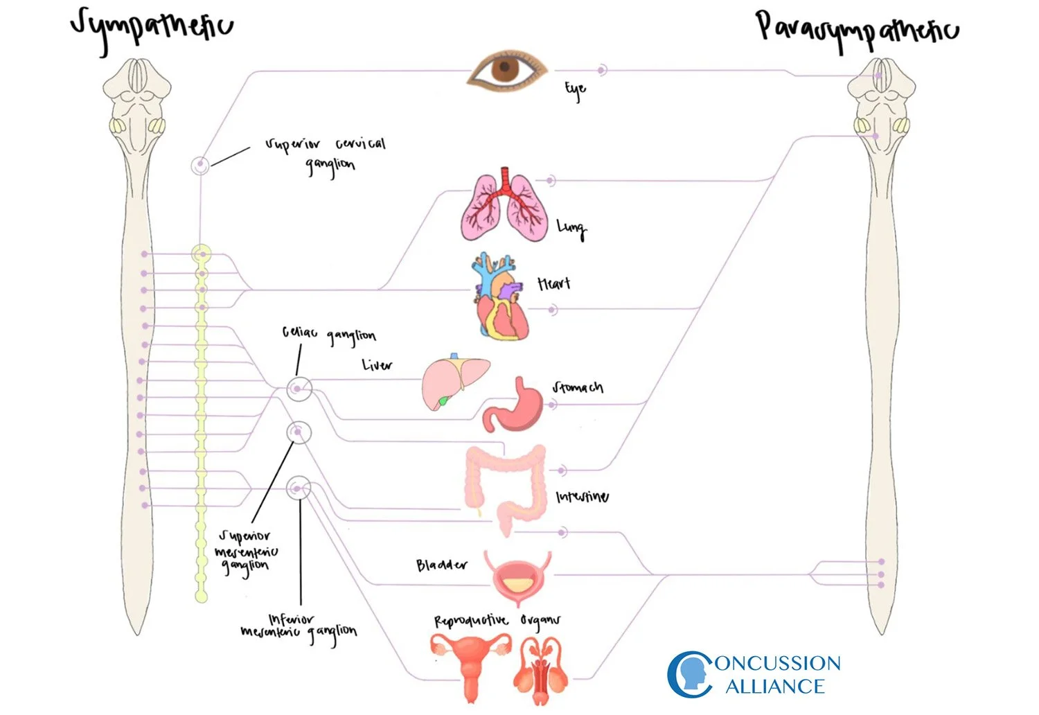 Visual, created by Lori Mae Yvette Calibuso Acob (2021 Concussion Alliance Intern), illustrating the different organs found in specific autonomic ganglion groups.