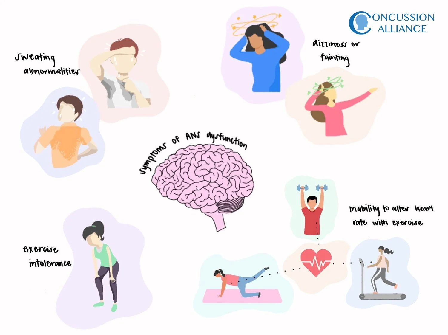 One of the many potential factors contributing to persistent post-concussion symptoms is autonomic nervous system (ANS) dysfunction. Unfortunately, most people who experience ANS dysfunction do not recognize its symptoms, such as anxiety/depression, irregular heart rate, exercise intolerance, and sweating abnormalities.