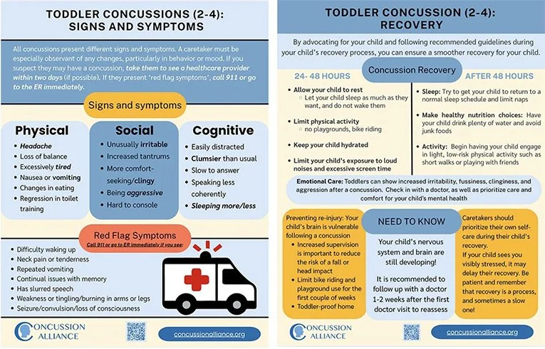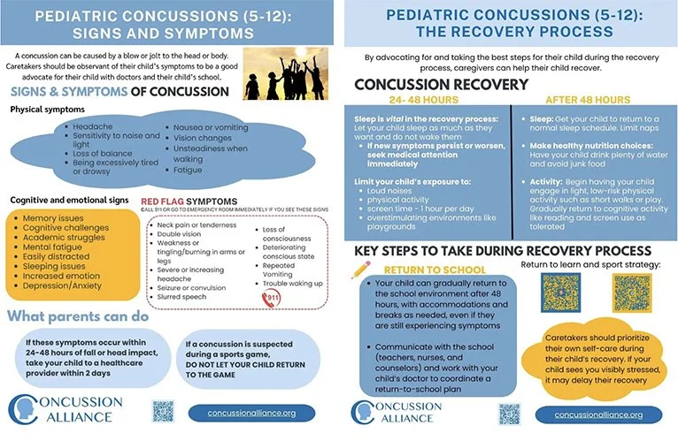Navigating Your Concussion, Persisting Symptoms (PCS) Guide, Adolescent Concussions (Age 13–18 Years), Pediatric Concussion (Children Age 5–12 Years), Toddler Concussions (Age 2–5 Years), and Infant Concussions (Age 0–24 Months).
