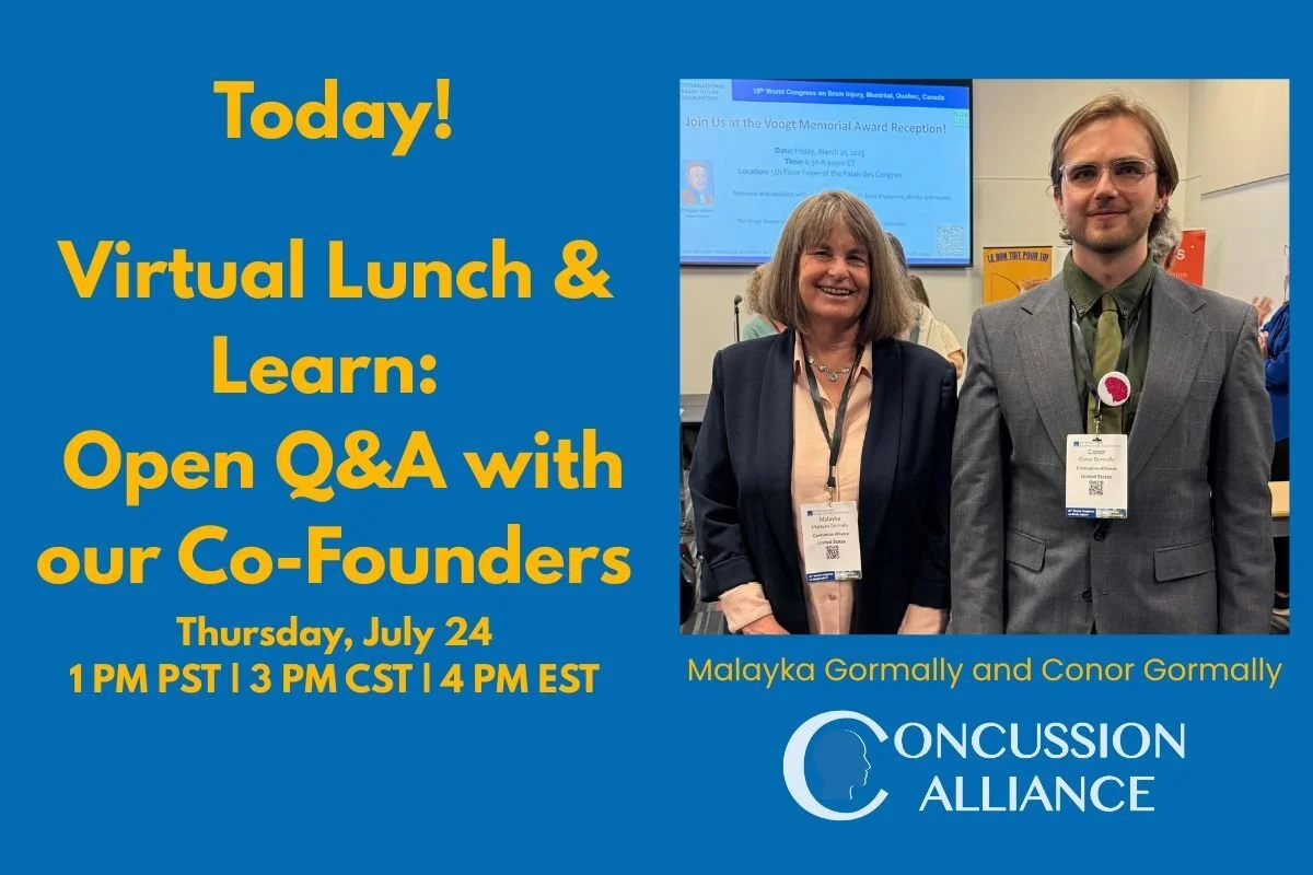 On July 24th at 1 PM PDT | 3 PM CDT | 4 EDT, join Concussion Alliance Co-Founders Conor Gormally & Malayka Gormally for our second virtual Lunch & Learn webinar! This Lunch & Learn will be an open Q&A with Conor and Malayka, so bring on your concussion questions!