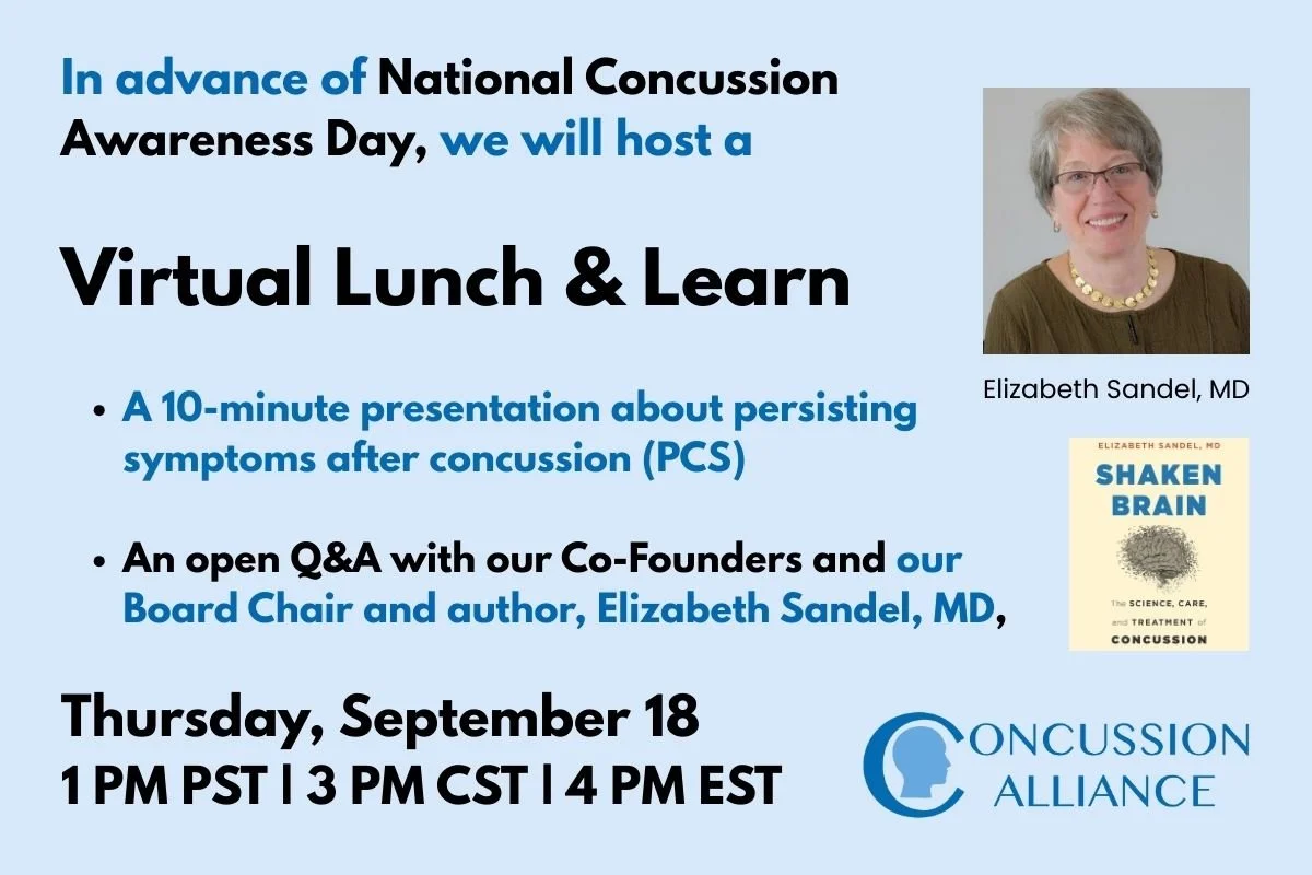 Thursday, September 18, 1 pm PT: A free virtual meeting, Concussion Alliance Lunch & Learn, starting with a presentation on our updated resources on recognizing and treating persisting symptoms after concussion (PCS), and then a Q&A with our Co-founders and our Board Chair, Elizabeth Sandel, MD. Learn more in the next section of this newsletter.